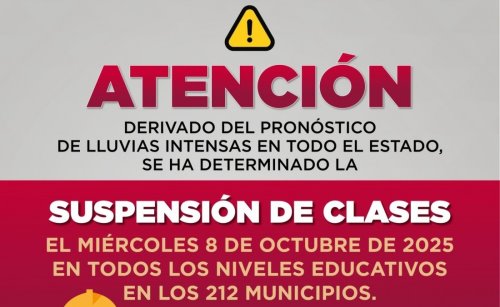 Este miércoles ocho de octubre se suspenden actividades escolares en todos los niveles educativos en los 212 municipios del estado de veracruz, ante el temporal lluvioso que se prevé en las próximas horas y días.