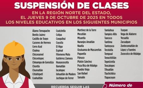 Como medida de continuidad y seguimiento a las accionespreventivas implementadas ante el temporal lluvioso, el Comité Estatal de Emergencias, en coordinación con la Secretaría de Educación, determinó mantener la suspensión de clases y labores de personal docente asícomo administrativo de centros escolares este jueves 09 de octubre en 58 municipios de la zona norte: